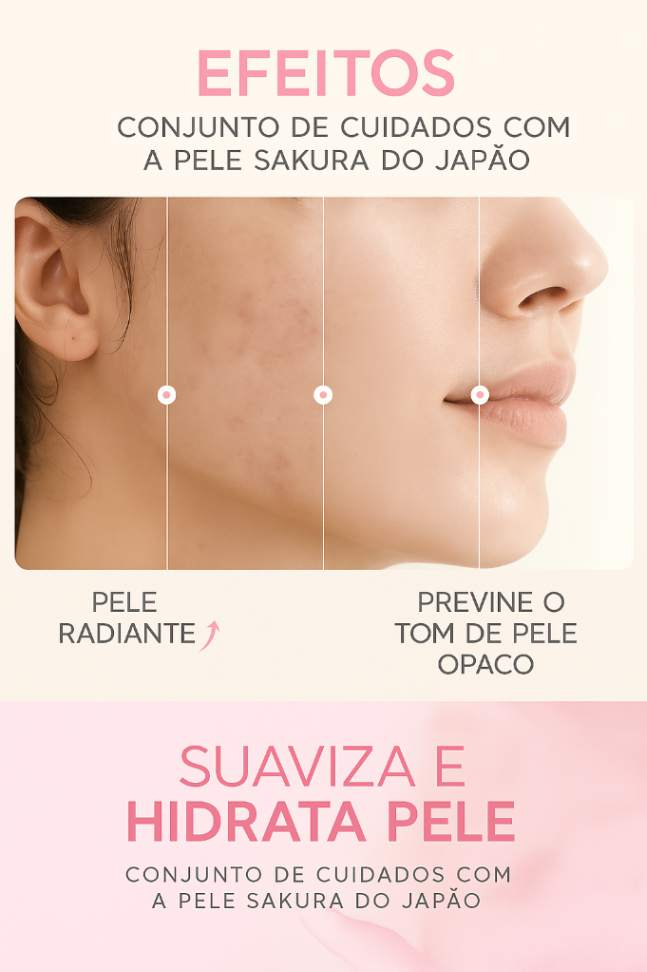 Cada produto do Kit Facial Sakura Glow foi cuidadosamente formulado para atender às necessidades da sua pele, proporcionando benefícios únicos e duradouros. Com ingredientes como extrato de flor de cerejeira, ácido hialurônico e vitaminas essenciais, este kit oferece hidratação intensa, nutrição profunda e proteção contra os danos causados pelo ambiente, deixando a sua pele rejuvenescida e radiante.